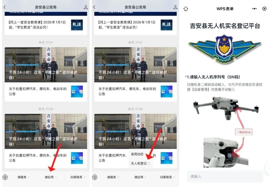 线上登记方法二:关注“吉安县公安”微信公众号,点击左下角的“微应用”,选择“无人机登记”,界面会自动跳转至吉安县无人机实名登记平台,按提示完成实名登记。