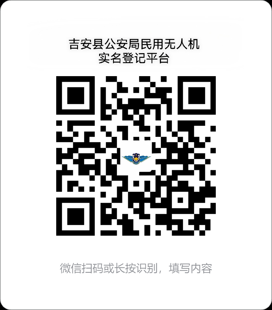 线上登记方法一:民用无人机持有者扫描下方二维码,进入吉安县无人机实名登记平台界面,填写无人机序列号(S/N码)、持有人姓名、身份证号、联系方式、居住区域区等内容,按流程填写完点击提交即可。